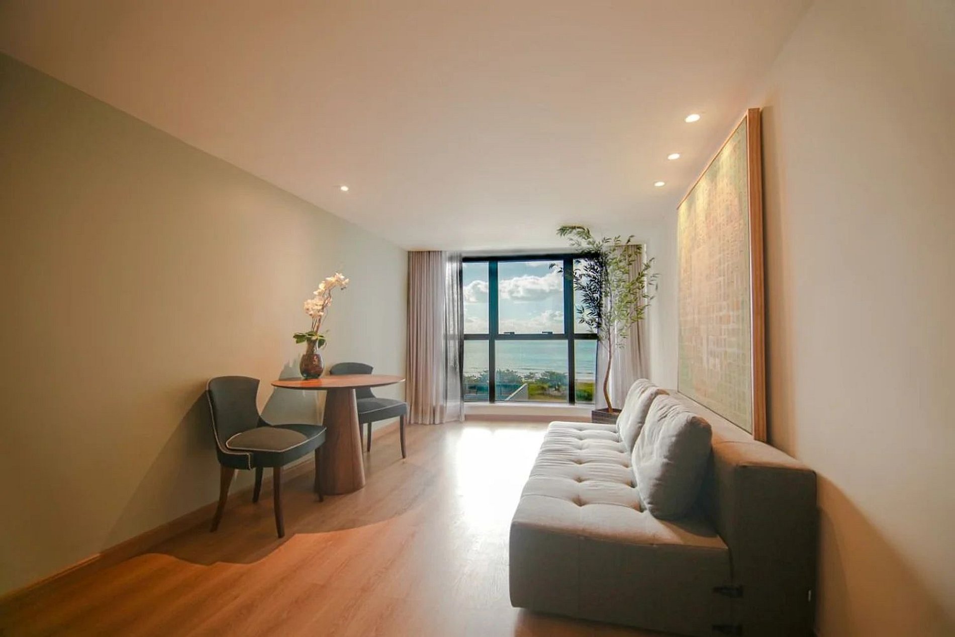 Apartamento decorado por arquiteta na praia de Boa Viagem, Recife, com cama king size, sofá-cama casal, TV Smart e Wi-Fi gratuito. O ambiente inclui sala de estar/jantar integradas, frigobar, micro-ondas, Split, cofre eletrônico e balcão com pia, com vista para o mar. O prédio oferece recepção 24h, academia, sauna, restaurante, serviço de quarto e estacionamento com manobrista. Localizado perto de shoppings, restaurantes, bares e com fácil acesso ao transporte (táxi, Uber).