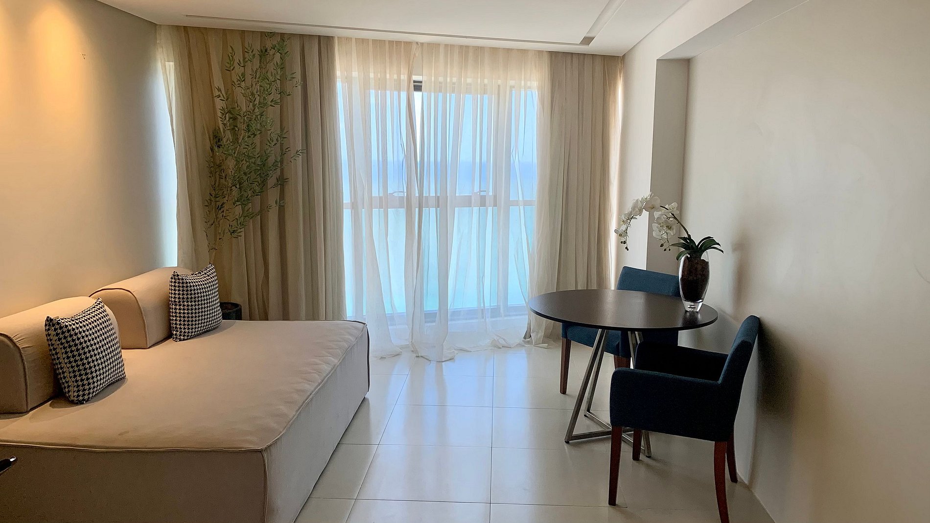 Flat Deluxe no 21º andar com cama king-size, sofá-cama, TV Smart, Wi-Fi gratuito e vista para a praia. Inclui frigobar, micro-ondas, ar-condicionado, cofre e mesa de trabalho. O prédio oferece recepção. Localizado na beira-mar, perto de shoppings, restaurantes e bares.