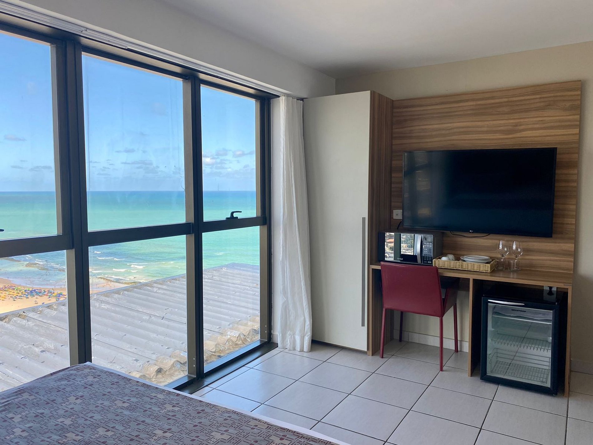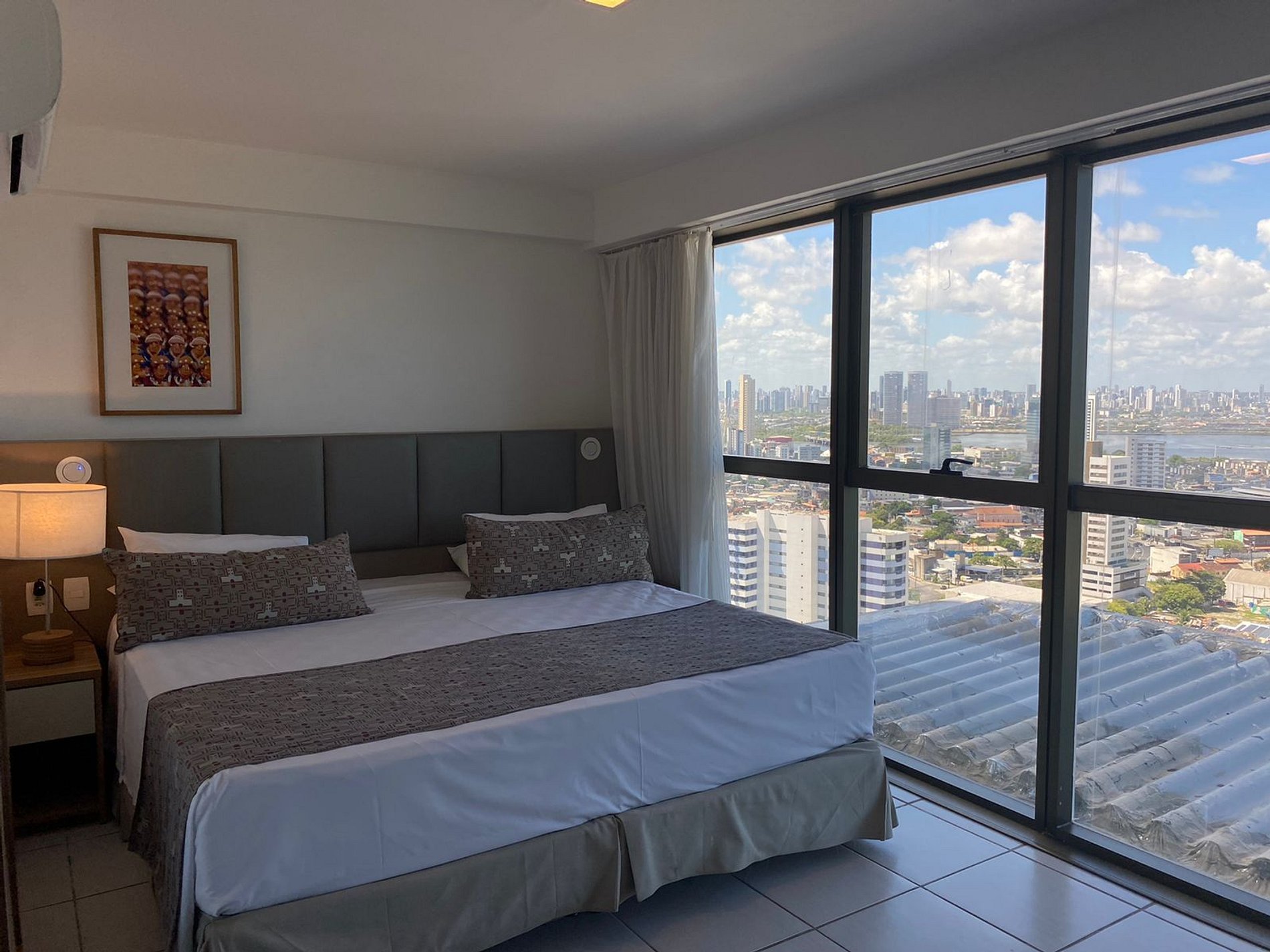 Apartamento com vista lateral para o mar, cama king size, TV a cabo, frigobar, Split, cofre eletrônico, cortinas blackout e Wi-Fi gratuito. O prédio oferece recepção bilíngue 24h, academia, sauna, restaurante (06:30-22:30) e estacionamento com manobrista 24h. Localizado em área nobre de Recife, próximo a shoppings, restaurantes e bares. A 1km do Shopping Rio Mar e Consulado Americano, e a 15 minutos do Aeroporto. Serviços adicionais como ferro elétrico e secador de cabelo.