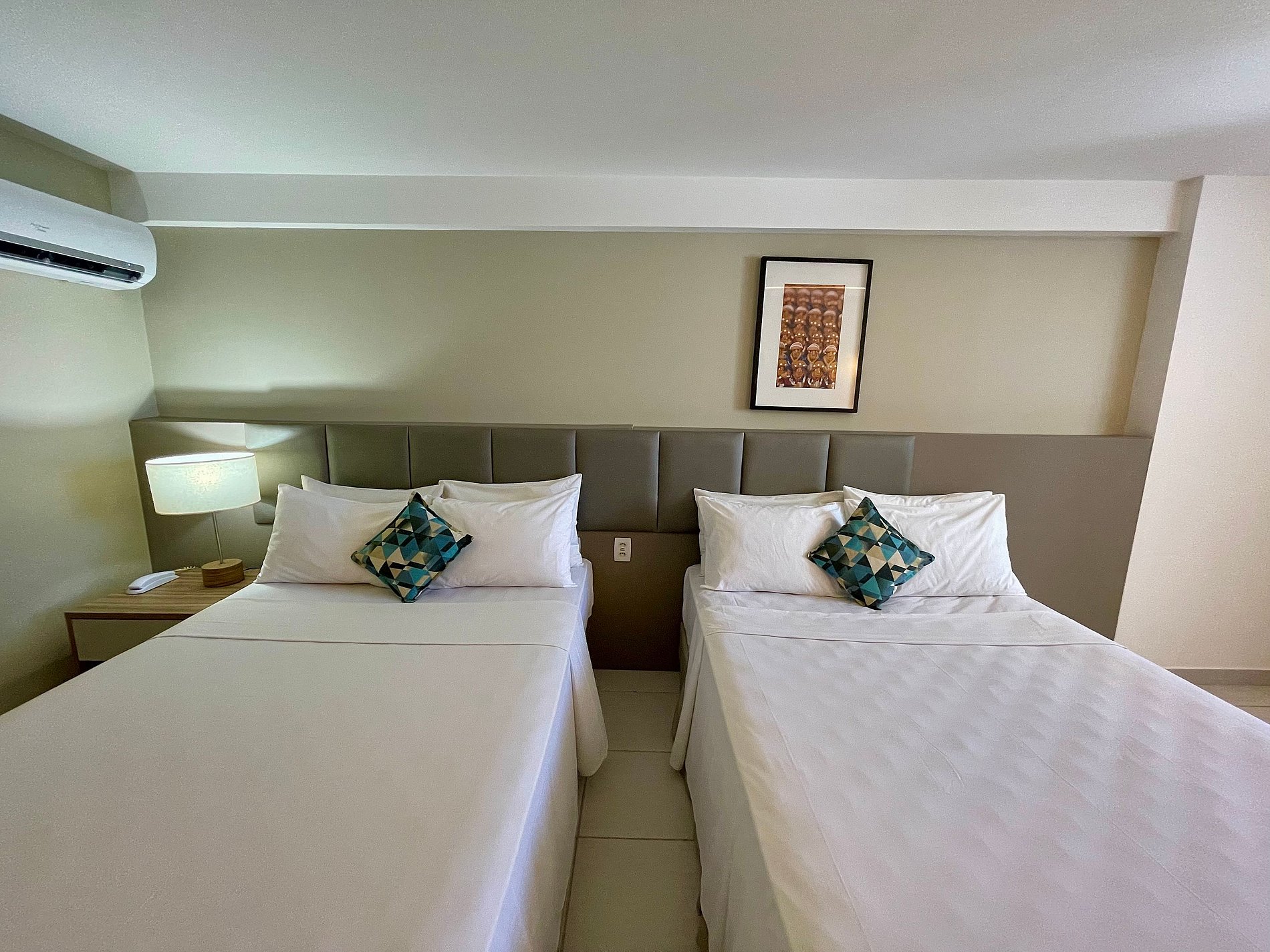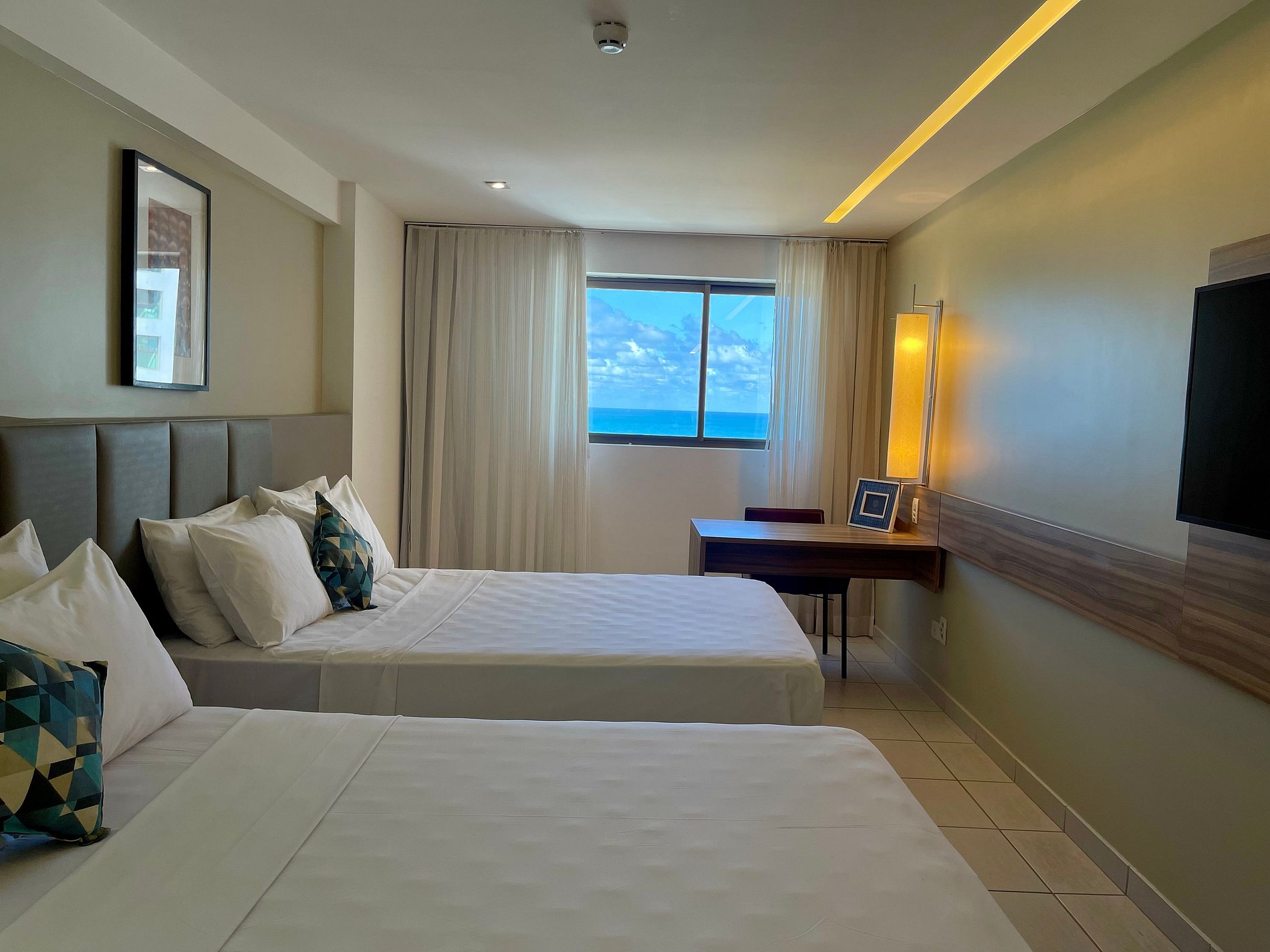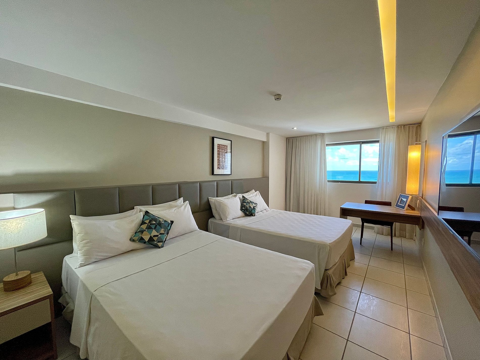 Apartamento minimalista e aconchegante, com duas camas de casal, TV Smart 50", TV a cabo, sistema de iluminação diferenciado, cortinas blackout e uma vista incrível da praia de Boa Viagem. Equipado com frigobar, micro-ondas, ar condicionado, cofre eletrônico e Wi-Fi gratuito. O prédio oferece recepção bilíngue 24h, academia, sauna, restaurante, e está situado em uma área nobre, perto de shoppings, restaurantes e bares. Acomodações pensadas oferecem conforto total.