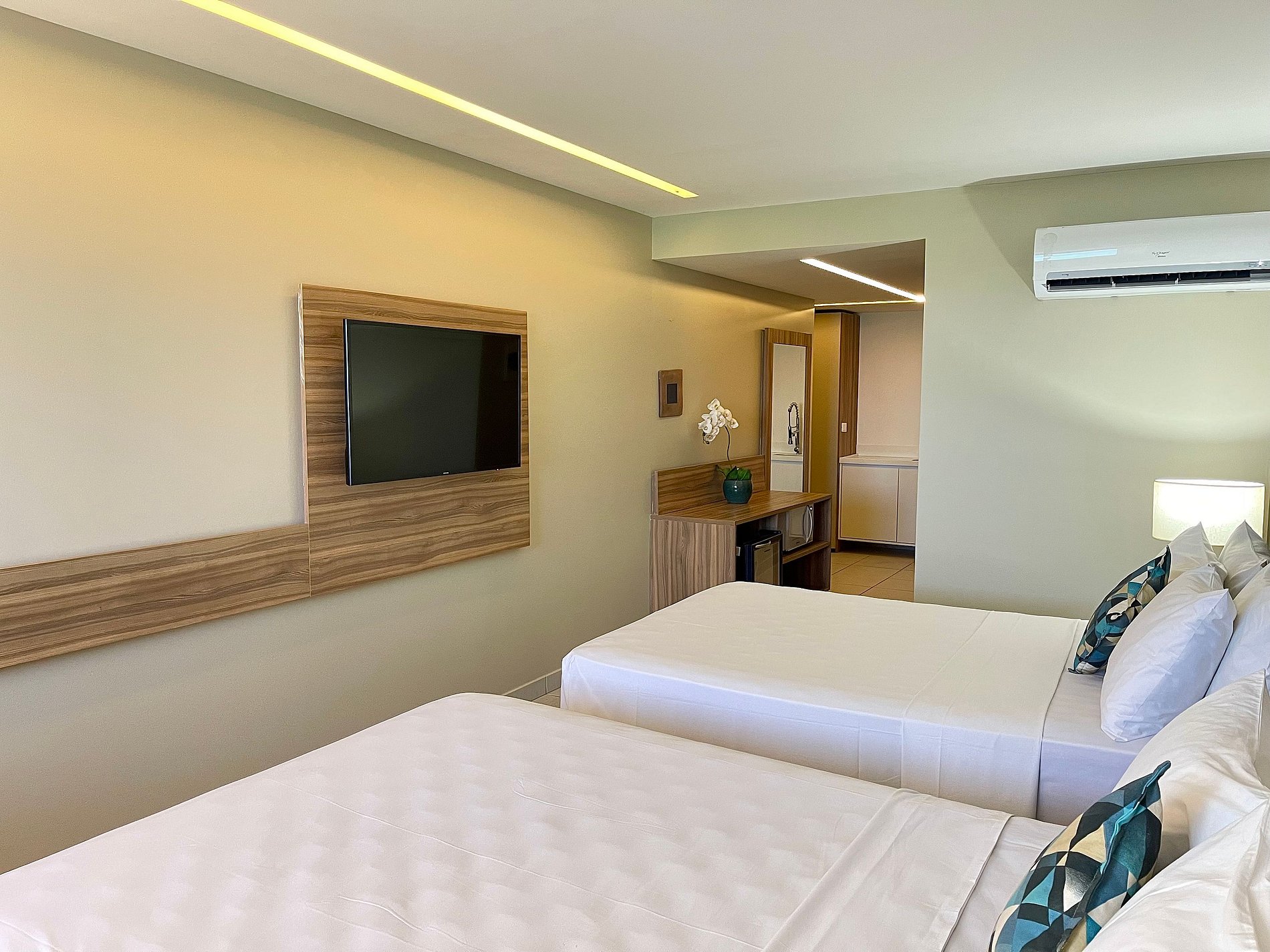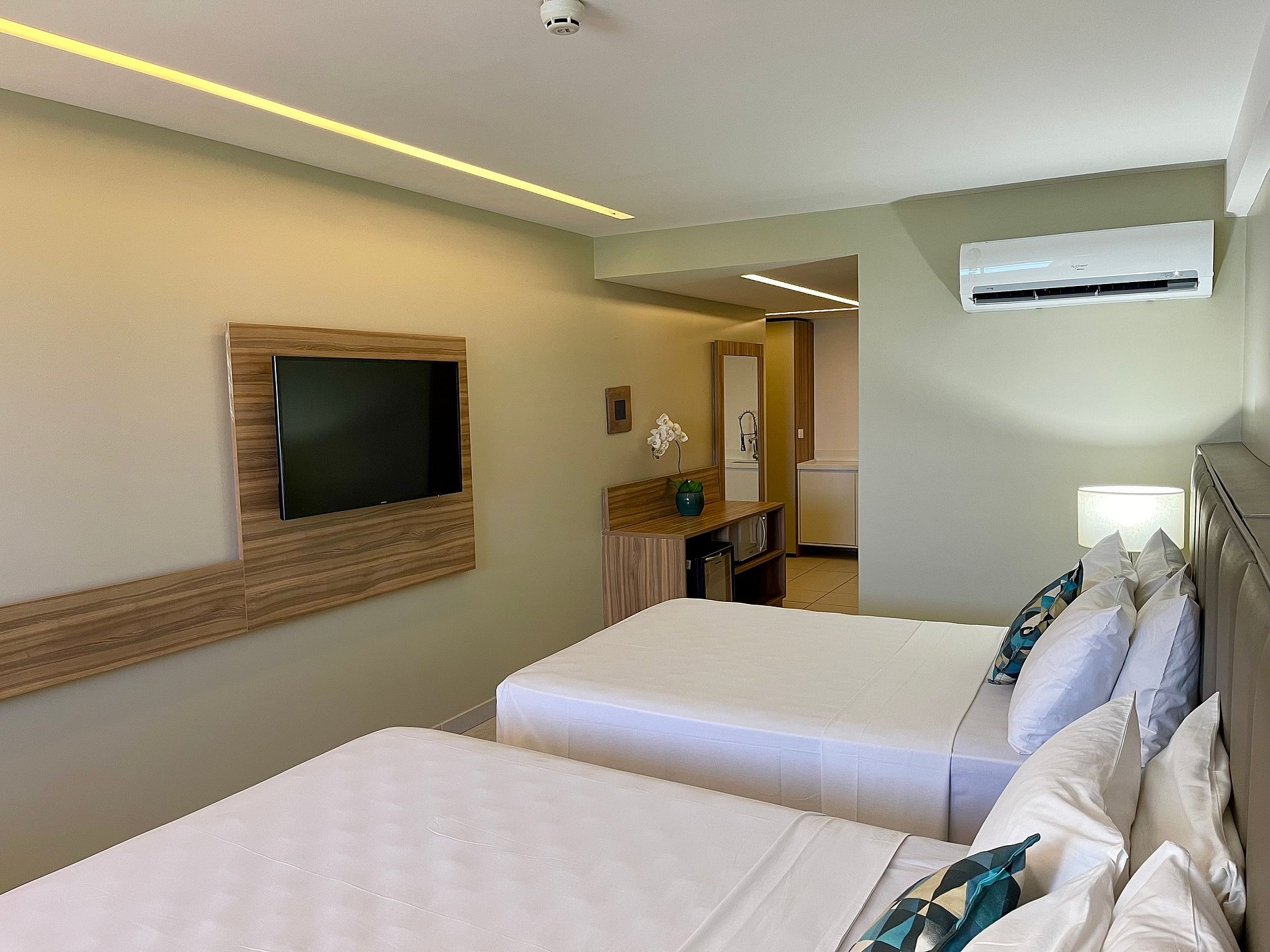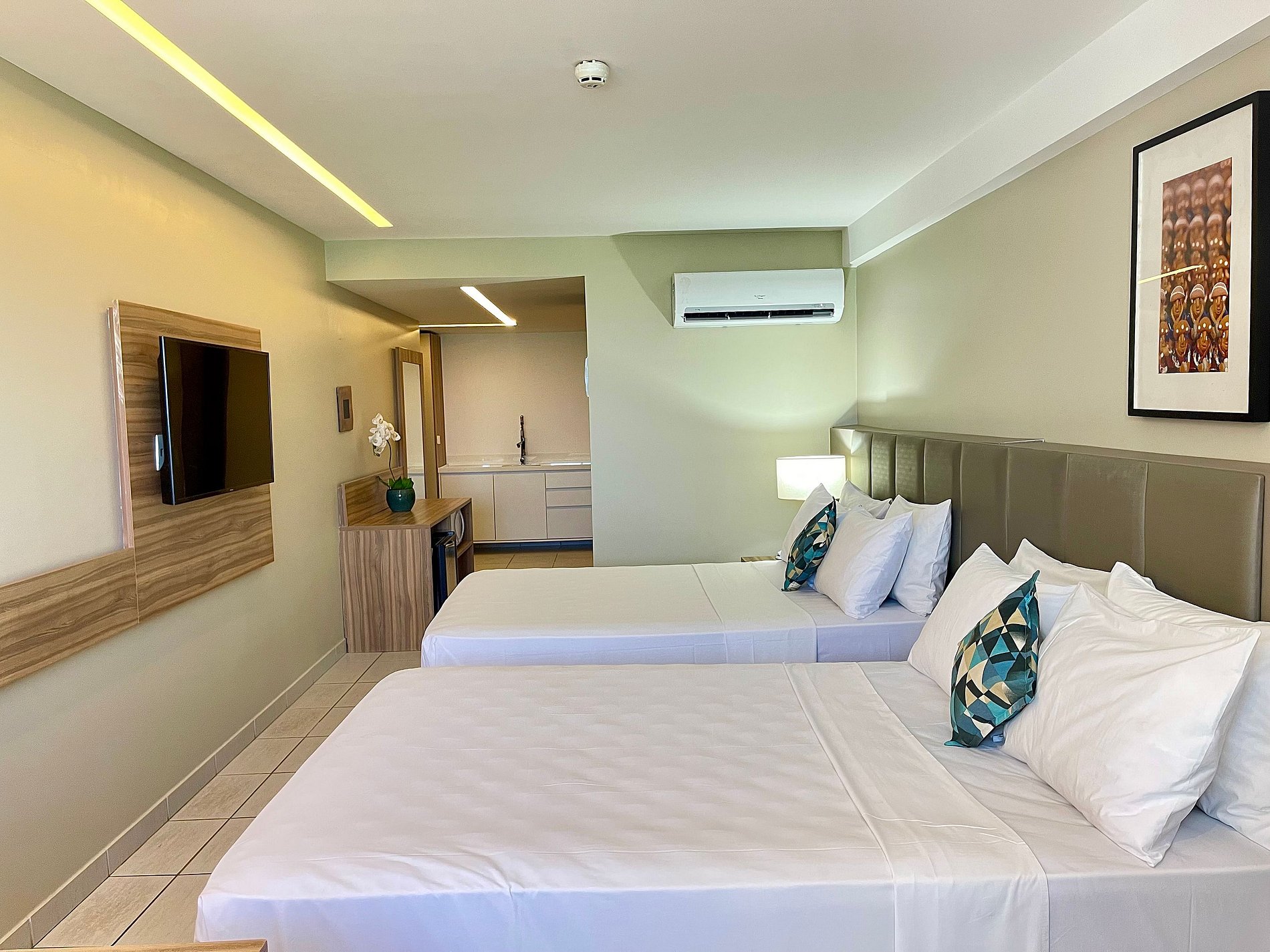 Apartamento minimalista e aconchegante, com duas camas de casal, TV Smart 50", TV a cabo, sistema de iluminação diferenciado, cortinas blackout e uma vista incrível da praia de Boa Viagem. Equipado com frigobar, micro-ondas, ar condicionado, cofre eletrônico e Wi-Fi gratuito. O prédio oferece recepção bilíngue 24h, academia, sauna, restaurante, e está situado em uma área nobre, perto de shoppings, restaurantes e bares. Acomodações pensadas oferecem conforto total.