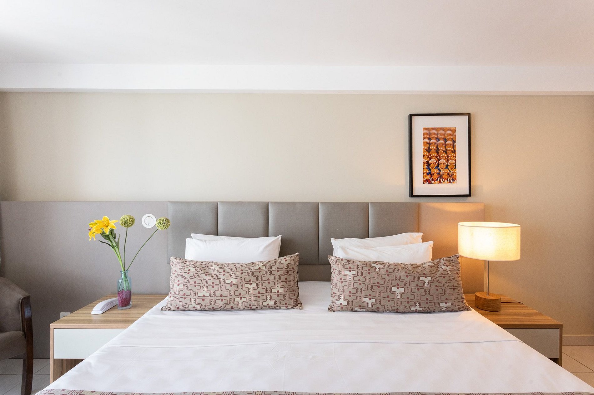 Apartamento com varanda lateral e vista para a cidade, equipado com cama king size, TV a cabo, Wi-Fi gratuito e sistema de iluminação aconchegante. Inclui frigobar, Split, cofre eletrônico, mesa de jantar/trabalho e cortinas blackout. O prédio oferece recepção 24h, academia, sauna, restaurante e estacionamento com manobrista. Localizado perto de shoppings, restaurantes e bares, com fácil acesso a transporte.