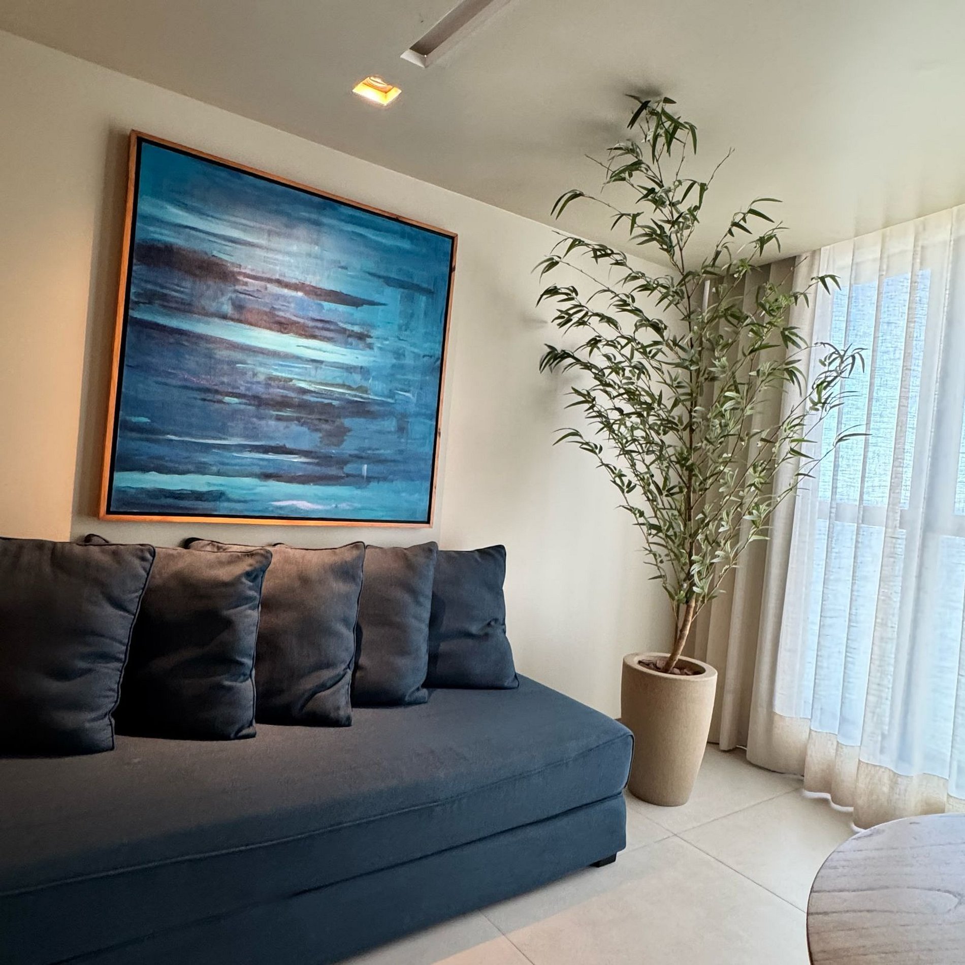 Apartamento decorado por arquiteta na praia de Boa Viagem, Recife, com cama king size, sofá-cama casal, TV Smart e Wi-Fi gratuito. O ambiente inclui sala de estar/jantar integradas, frigobar, micro-ondas, Split, cofre eletrônico e balcão com pia, com vista para o mar. O prédio oferece recepção 24h, academia, sauna, restaurante, serviço de quarto e estacionamento com manobrista. Localizado perto de shoppings, restaurantes, bares e com fácil acesso ao transporte (táxi, Uber).