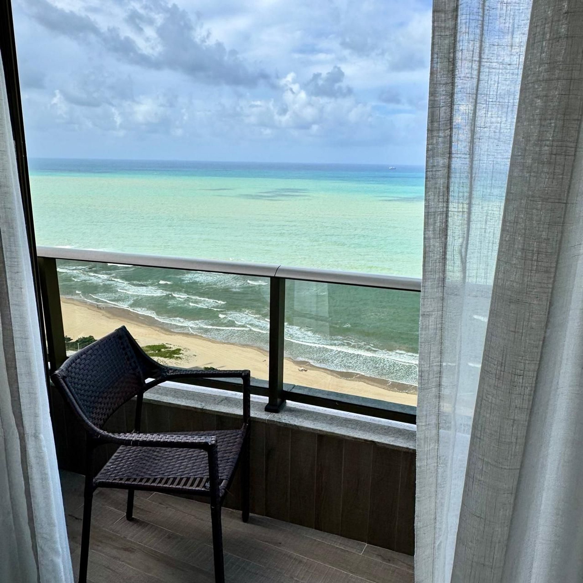 Apartamento no 24° andar com varanda vista para o mar, decorado por arquiteta. Conta com cama king size, sofá cama casal, TV Smart, frigobar, micro-ondas, Split, cofre eletrônico, cortinas blackout, mesa de trabalho e Wi-Fi. O prédio oferece recepção 24h, academia, sauna, restaurante, estacionamento com manobrista e serviços como ferro e secador. Localizado na Praia de Boa Viagem, perto de shoppings e restaurantes, a 1km do Shopping Rio Mar e 15 minutos do Aeroporto.