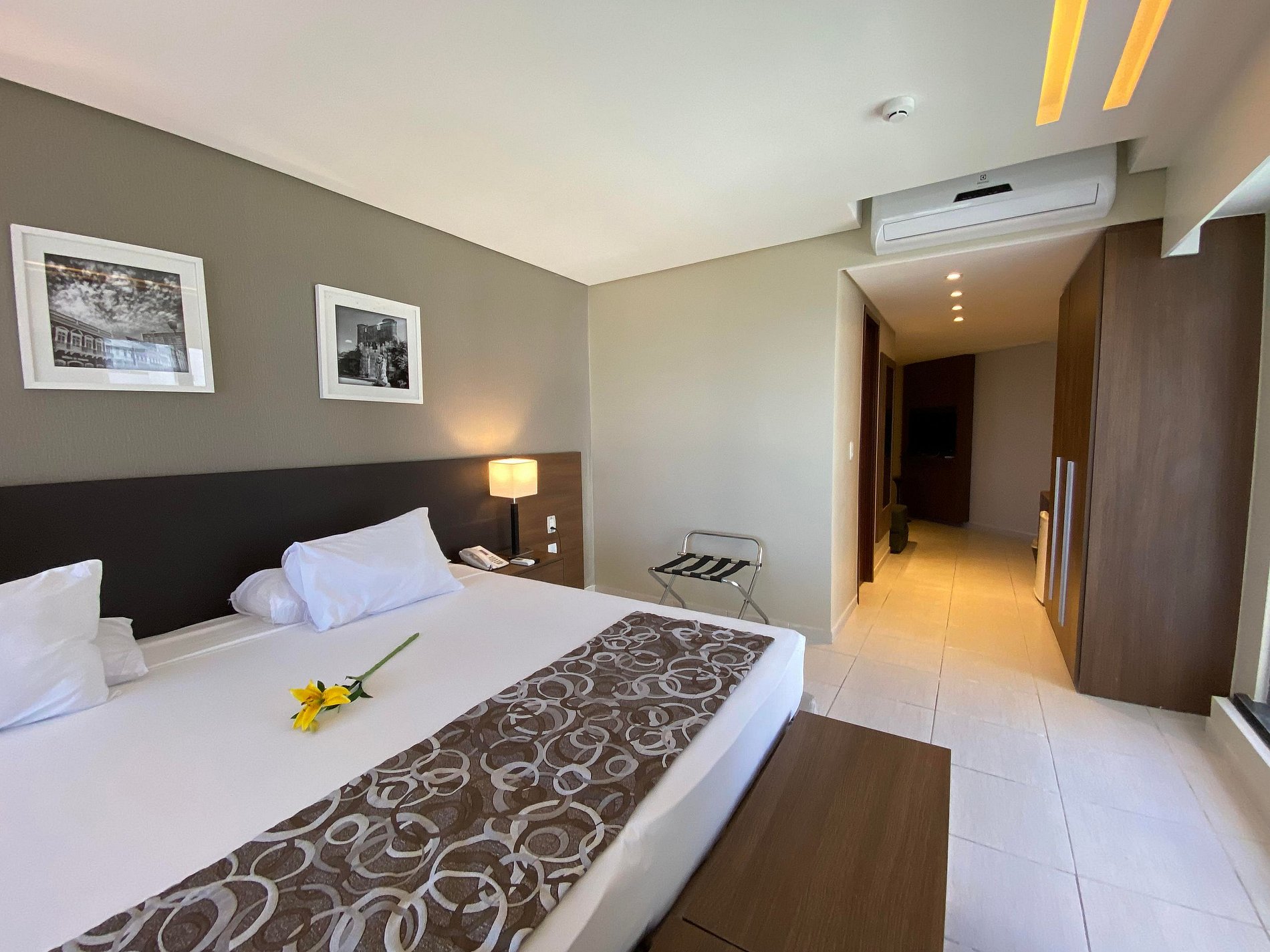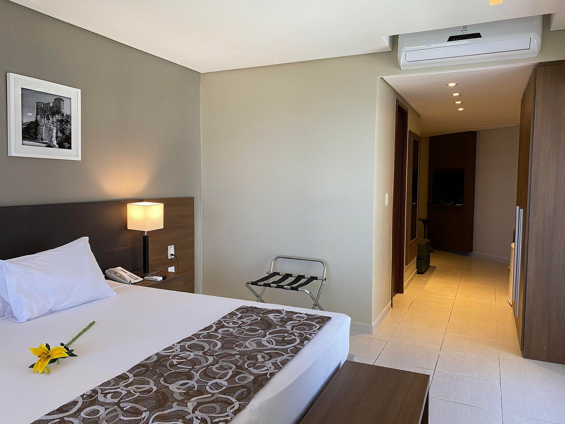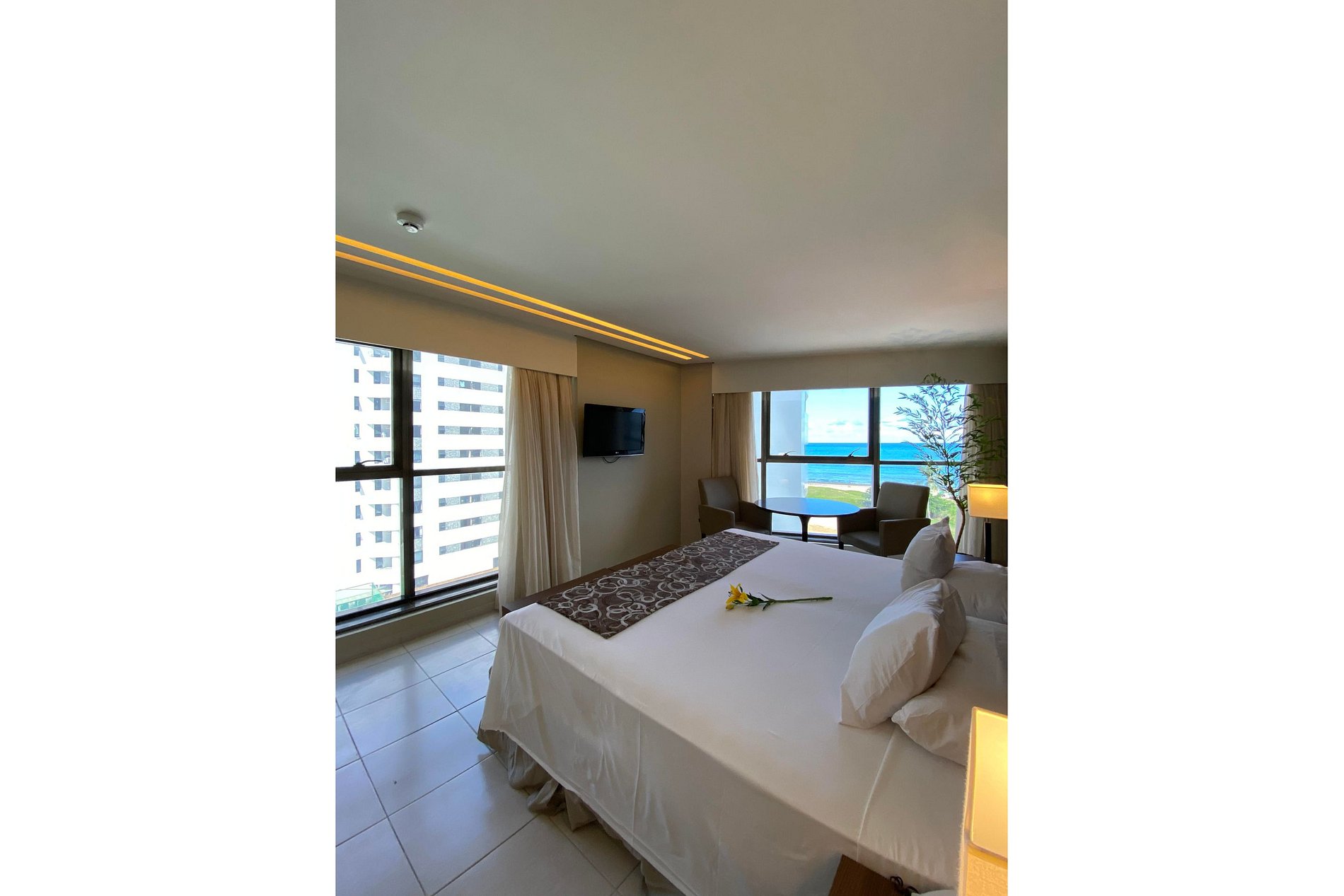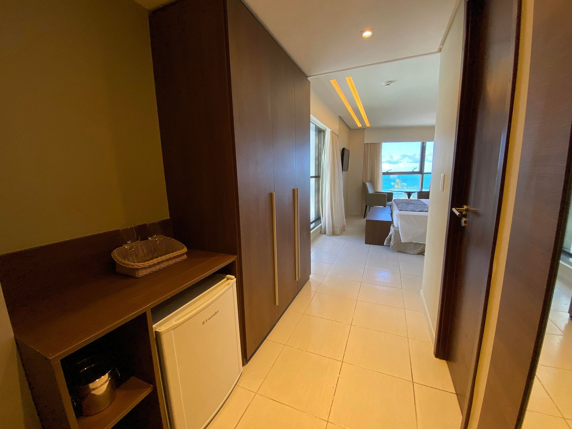 Suite com cama king-size, sofá-cama, TV a cabo, Wi-Fi gratuito e vista para a praia. Inclui frigobar, Split, cofre e mesa de trabalho. O prédio oferece recepção 24h, academia e restaurante. Localização privilegiada, perto de shoppings, restaurantes e bares.