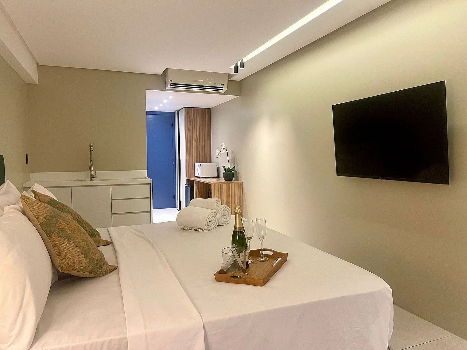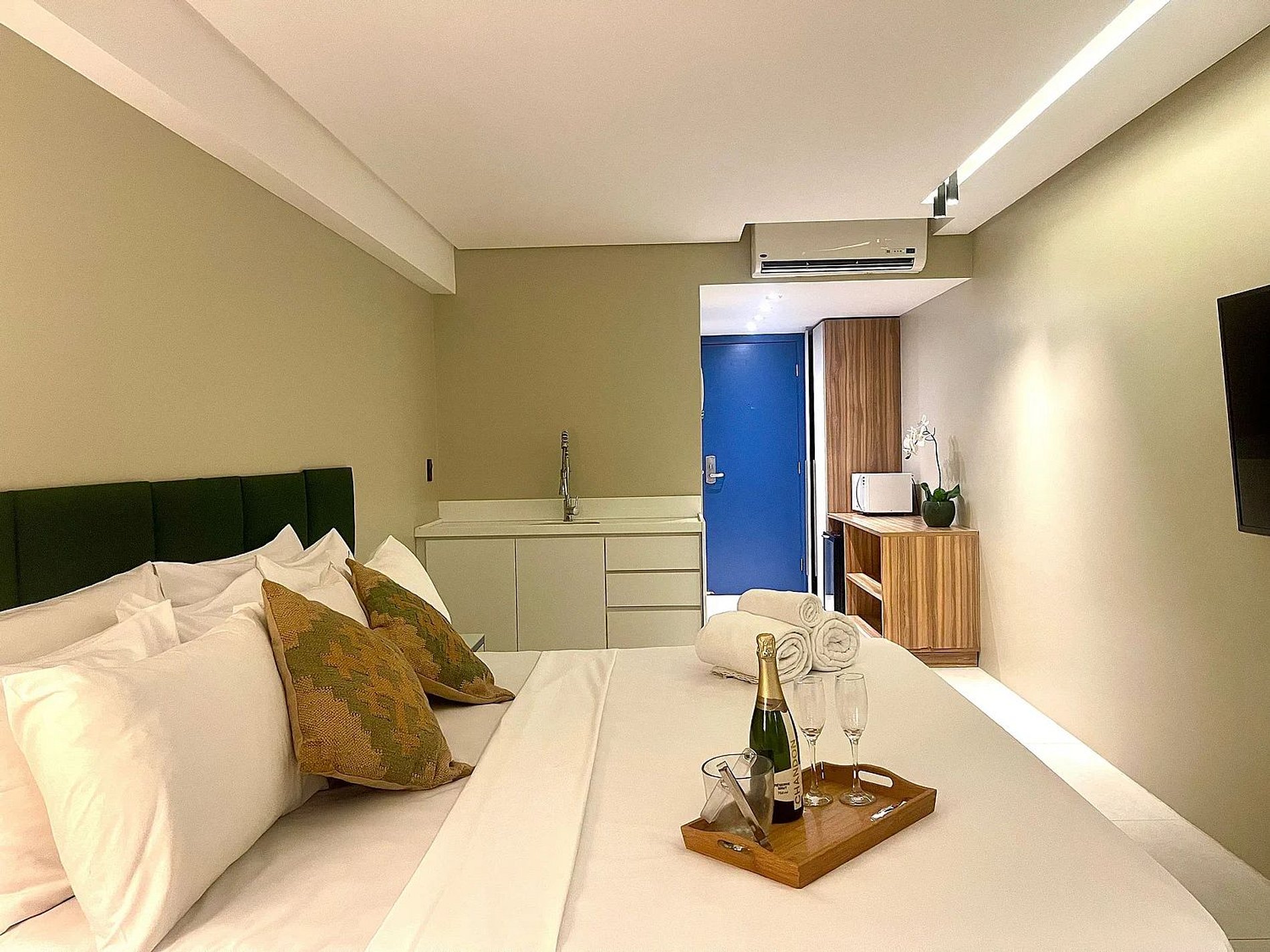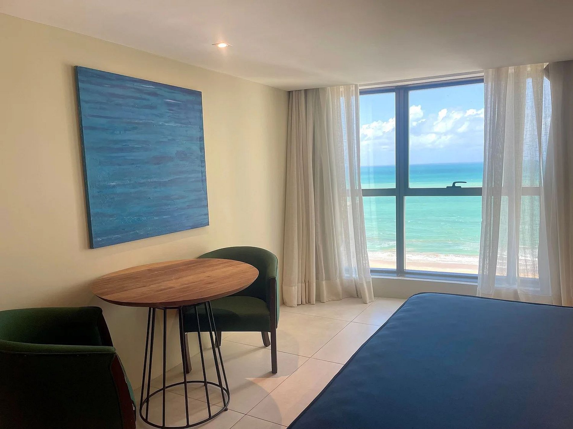 Apartamento na beira-mar da praia de Boa Viagem, Recife, decorado por arquiteta, com cama king size, sofá-cama casal, TV Smart, Wi-Fi gratuito e vista para o mar. Inclui sala de estar e jantar integradas, frigobar, micro-ondas, Split, cofre eletrônico e balcão com pia. O prédio oferece recepção 24h, academia, sauna, restaurante e serviço de quarto. Localizado perto de shoppings, restaurantes e bares, com fácil acesso a transporte (táxi, Uber). Estacionamento privativo com manobrista disponível.