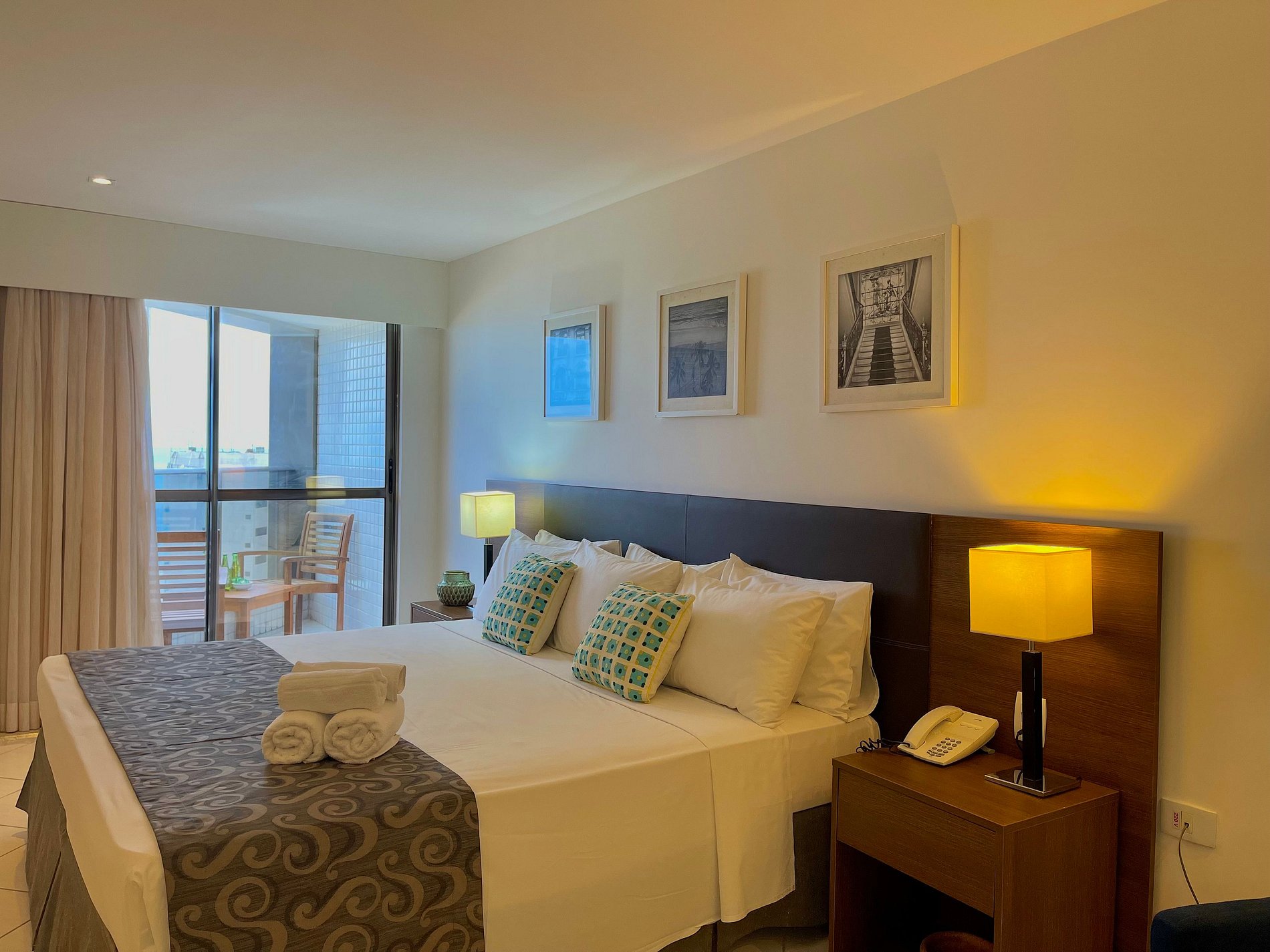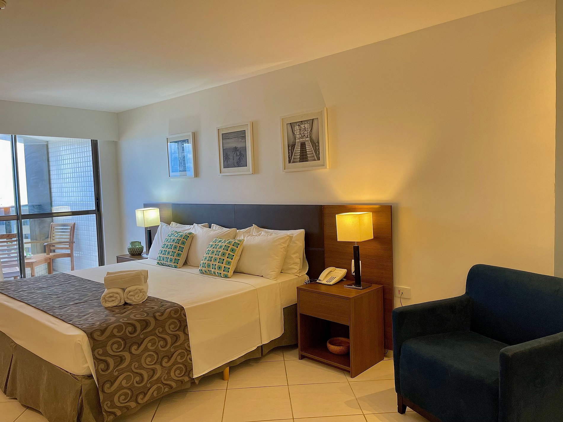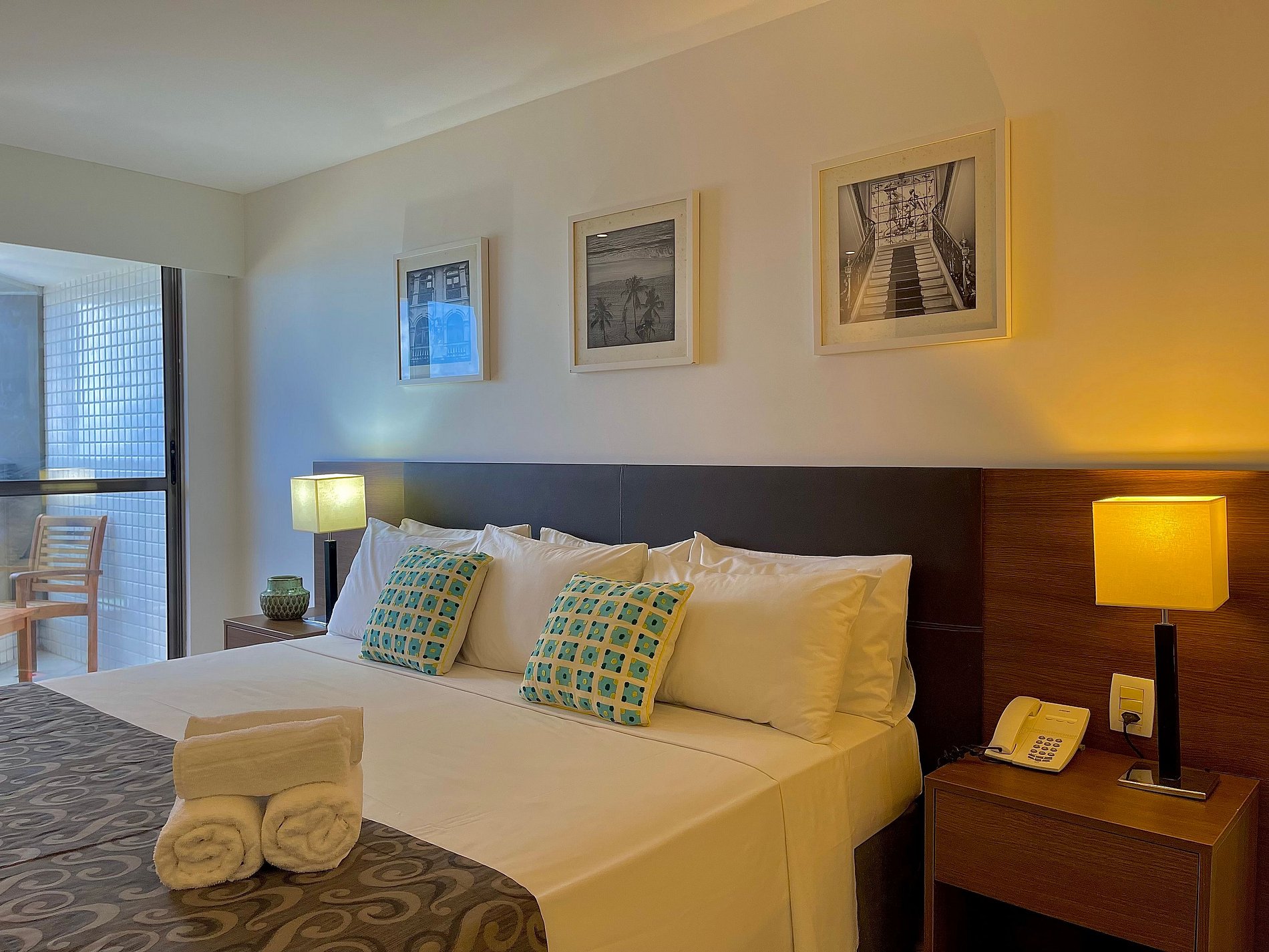 Suíte no 13º andar com cama king-size, TV a cabo, Wi-Fi gratuito e vista para a praia. Inclui frigobar, Split, cofre e mesa de trabalho. O prédio oferece recepção 24h, academia e restaurante. Localização excelente, perto de shoppings, restaurantes e bares. Estacionamento incluído e manobrista disponível.