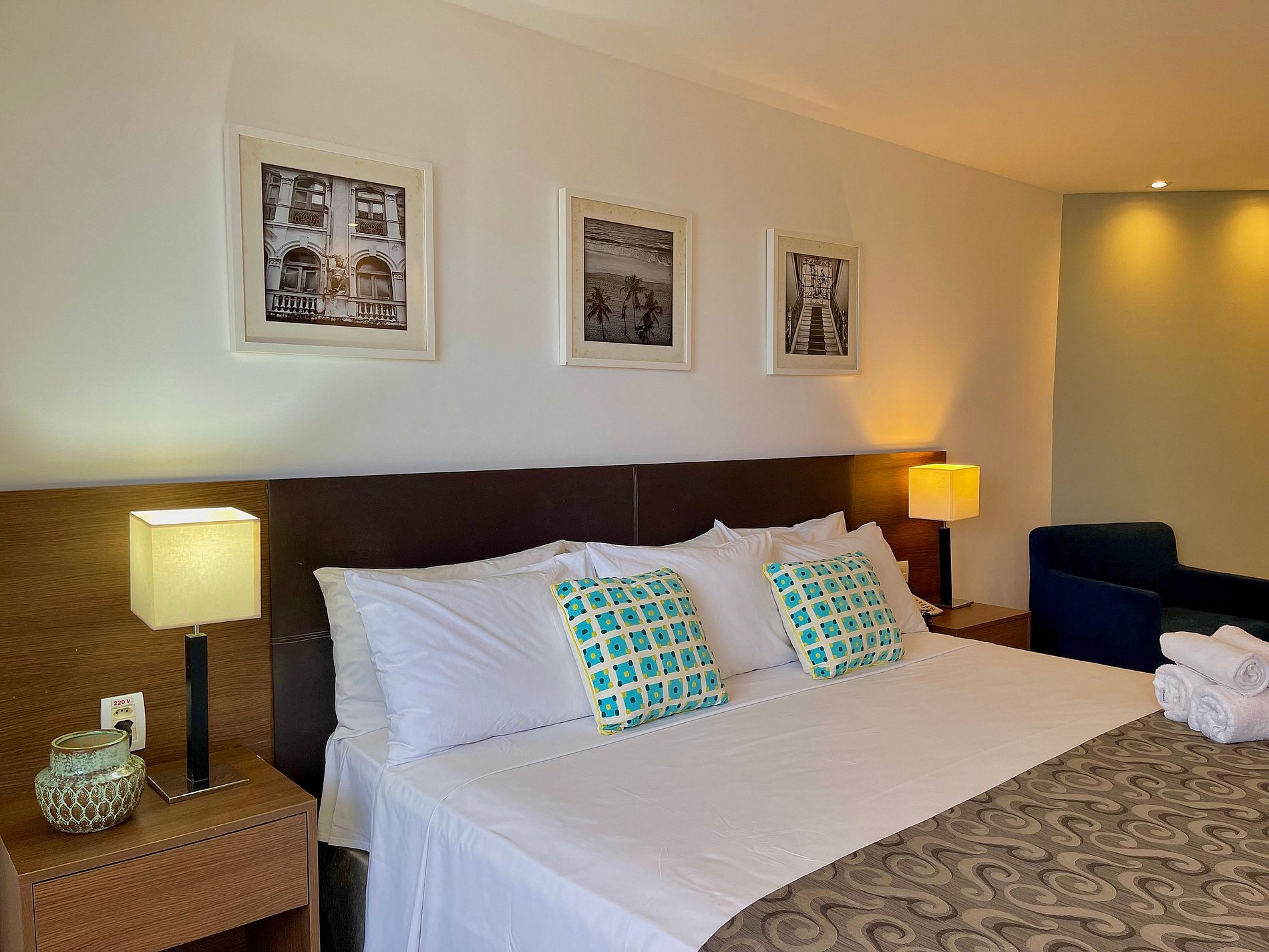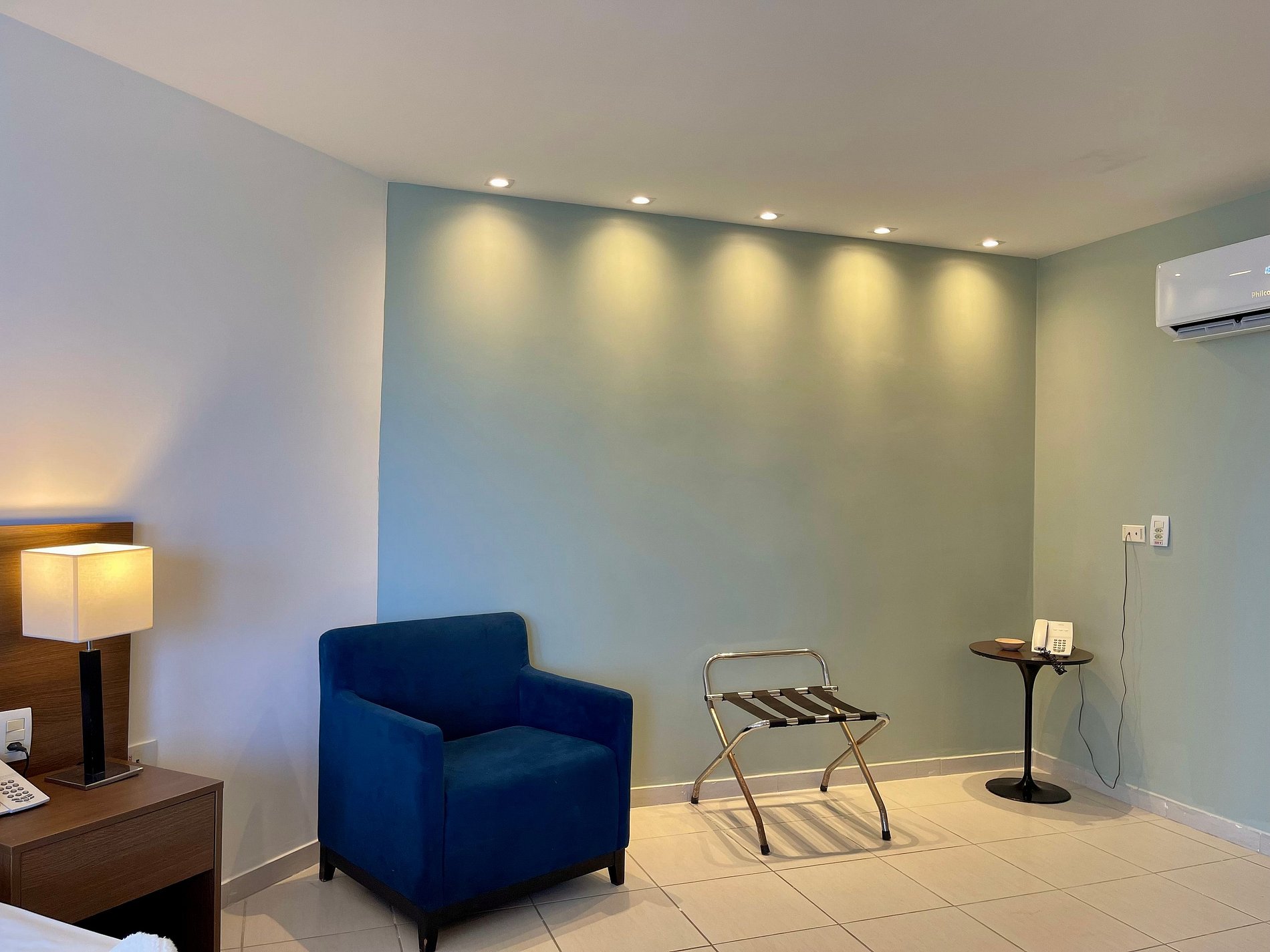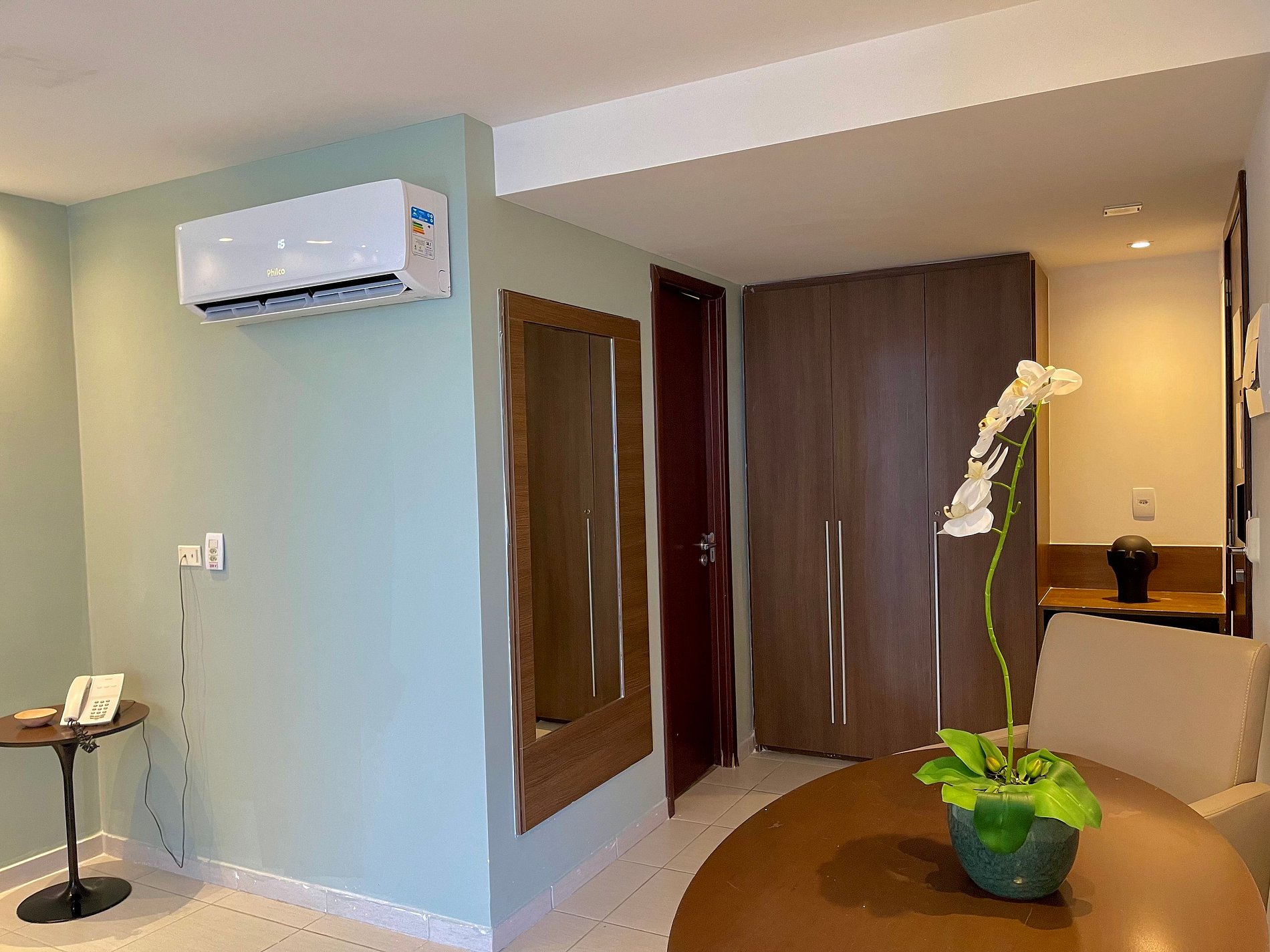 Suíte no 13º andar com cama king-size, TV a cabo, Wi-Fi gratuito e vista para a praia. Inclui frigobar, Split, cofre e mesa de trabalho. O prédio oferece recepção 24h, academia e restaurante. Localização excelente, perto de shoppings, restaurantes e bares. Estacionamento incluído e manobrista disponível.