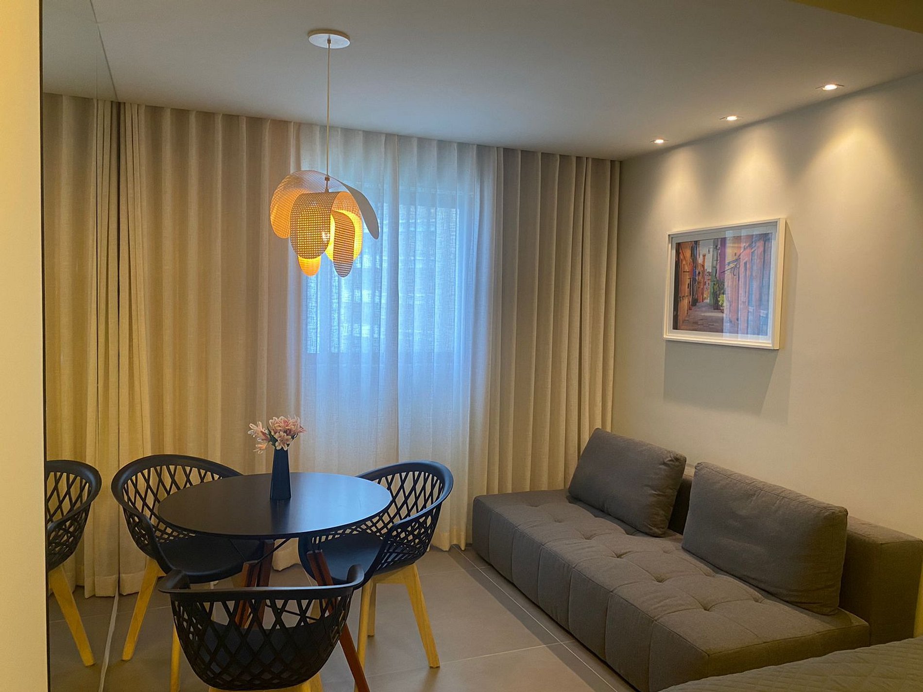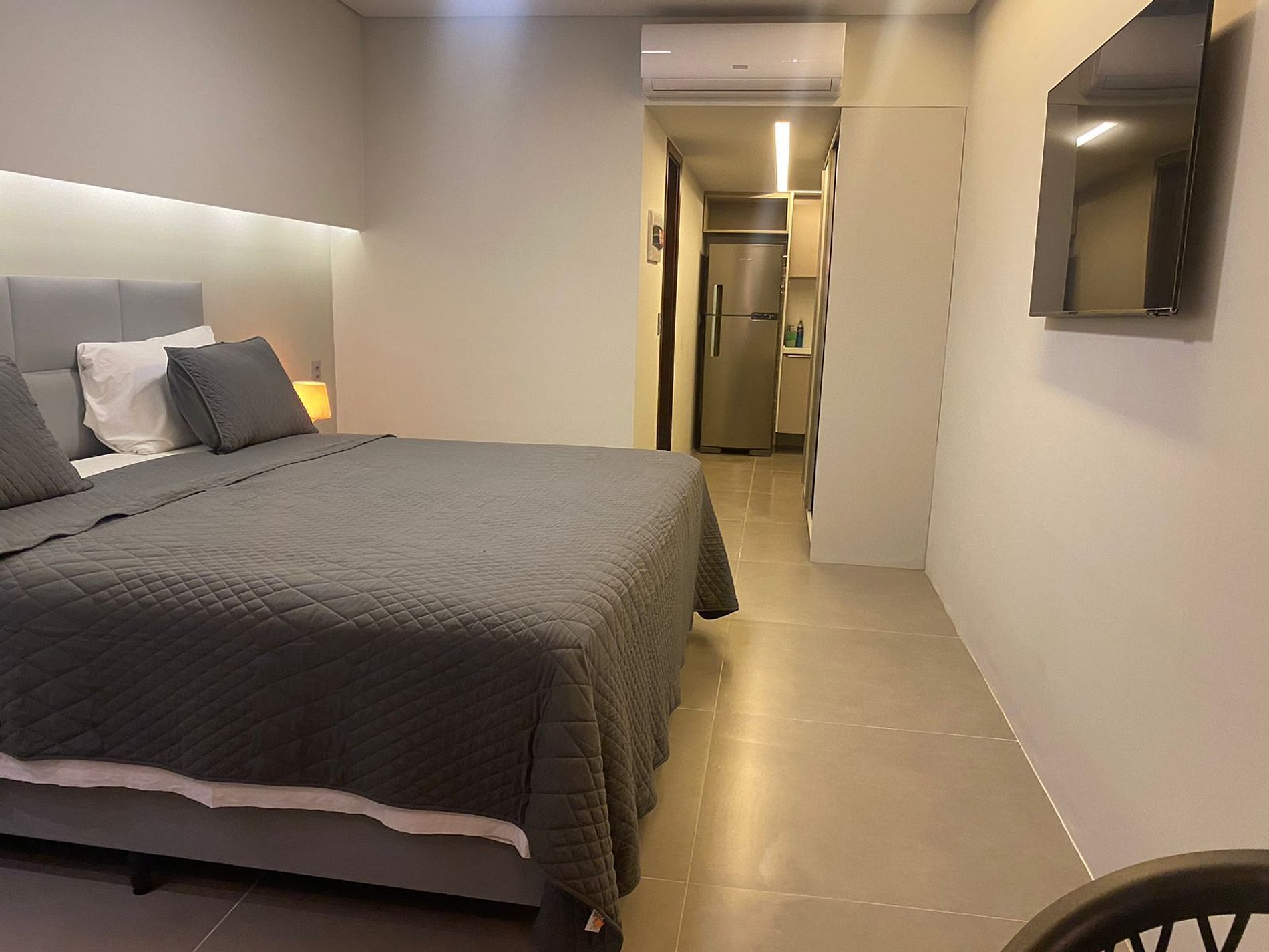 Apartamento com decoração clean e minimalista, cama Queen, sofá-cama, TV a cabo, Wi-Fi gratuito e vista para a praia de Boa Viagem. Equipado com frigobar, micro-ondas, Split e cofre eletrônico. O prédio oferece recepção 24h, academia, sauna e restaurante. Localização privilegiada perto de shoppings, restaurantes e transportes. Estacionamento privativo e serviço de manobrista 24h. Localizado em área nobre de Recife, próximo a shoppings, restaurantes e bares.